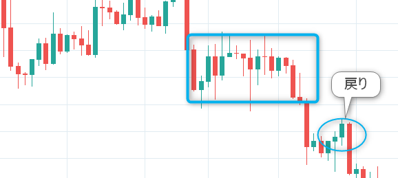 下降トレンドでレンジをブレイクした後、多くの初心者は即座に売りのポジションを取ろうとします。しかし、プロのトレーダーは違います。彼らは一度上昇する「戻り」を待ち、そこから売りのポジションを取ります。この「戻り」を利用することで、より有利な価格でエントリーできるのです。
